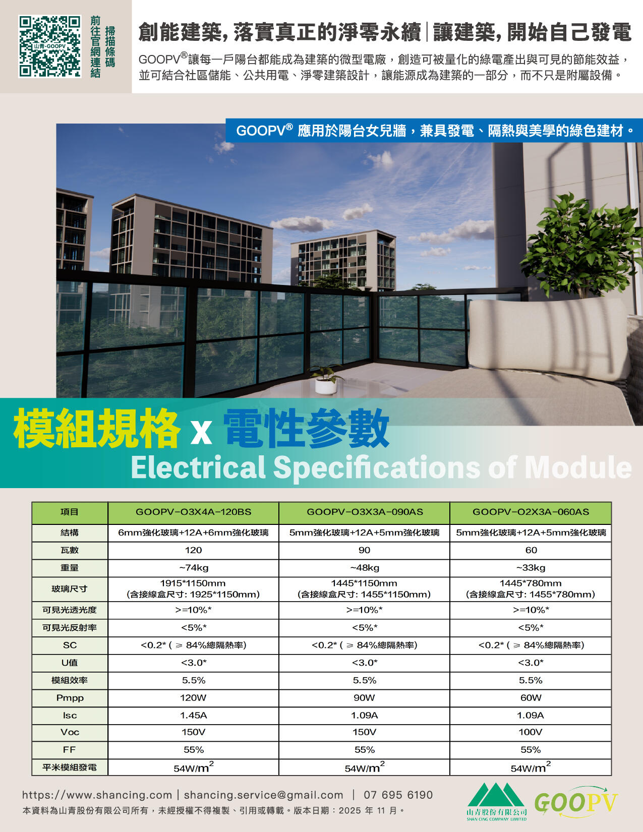GOOPV 是山青股份有限公司的創新多功能光建築材料,融合太陽能發電、隔熱、透光、隔音與安全技術,具備大尺寸與半透明特性,